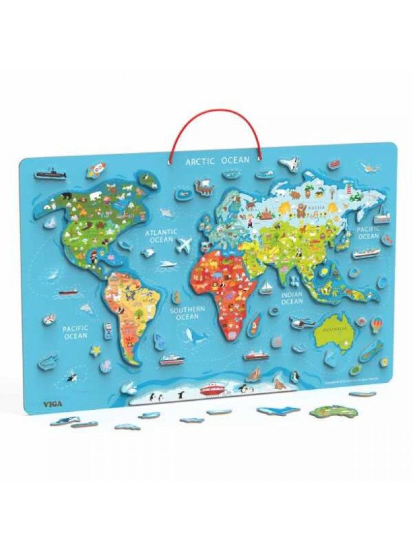 Dzięki tej tablicy dzieci mogą rysować na odwrotnej stronie, rozwijając swoją kreatywność oraz zręczność. Produkt zawiera 106 magnetycznych elementów, które można umieszczać na mapie świata, poznając geografię i faunę różnych regionów.