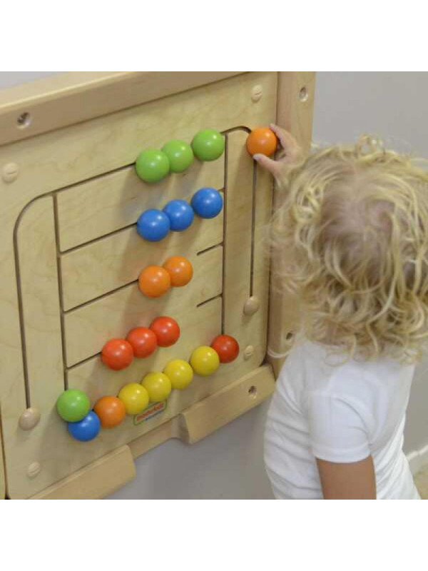 • Kolorowe koraliki oraz przesuwane labirynty w różnych kształtach, co dodatkowo stymuluje naukę kolorów oraz rozwija zdolności manualne.