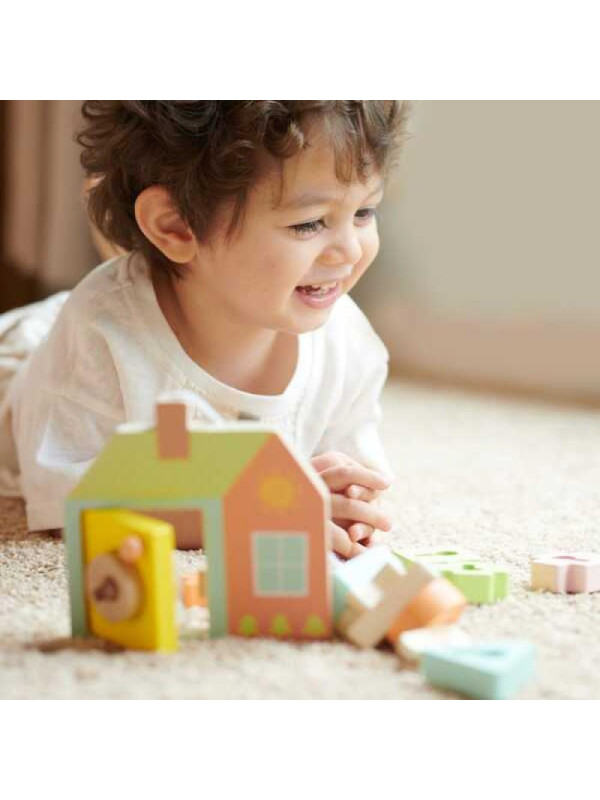 CLASSIC WORLD Drewniana Przeplatanka to wspaniała zabawka oparta na metodzie Montessori, która zachwyci dzieci powyżej 18 miesiąca życia. Zestaw składa się z drewnianego domku, 11 różnokolorowych klocków oraz sznureczka z kluczem.