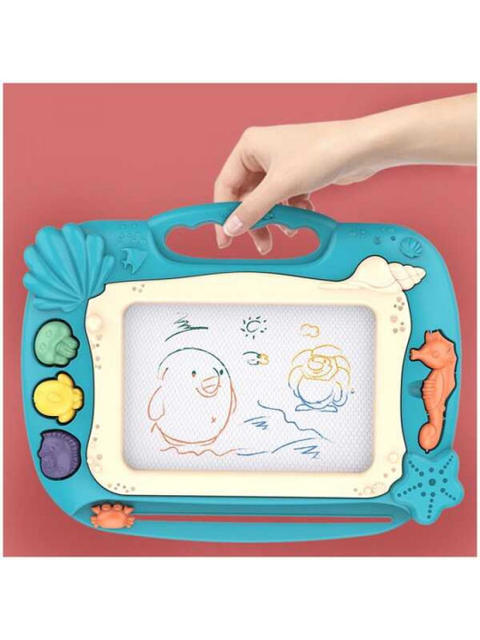 Ten zielony znikopis z motywem oceanu został zaprojektowany z myślą o komforcie dzieci. Posiada wygodny uchwyt, dzięki któremu dziecko może zabrać tablicę wszędzie. W zestawie znajduje się magiczny długopis oraz trzy wesołe stempelki, które urozmaicą każdą pracę artystyczną. Tablica jest łatwa w użyciu – wystarczy przejechać specjalnym suwakiem, a rysunek natychmiast zniknie, umożliwiając tworzenie nowych arcydzieł.