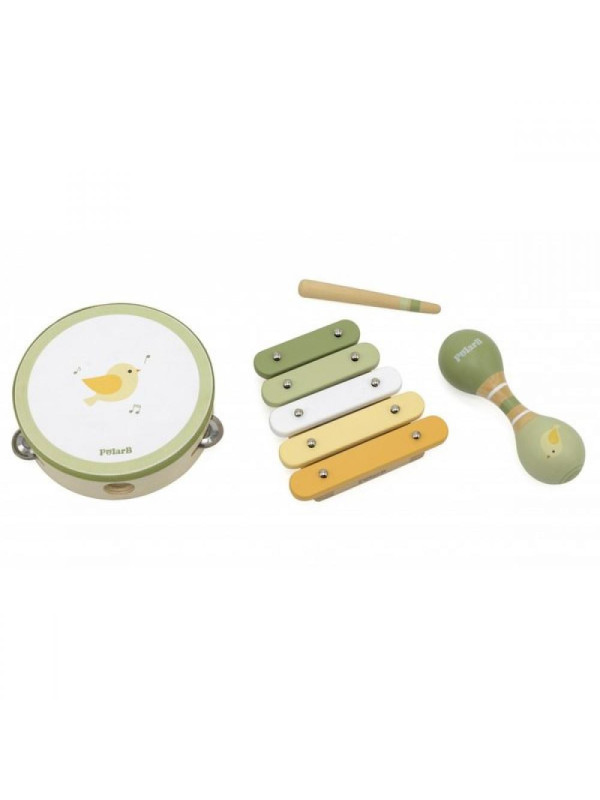 W skład zestawu wchodzą trzy instrumenty, wszystkie wykonane z wysokiej jakości drewna lakierowanego i pomalowane nietoksycznymi farbami w zachwycających pastelowych kolorach. Znajdujące się w zestawie instrumenty to: