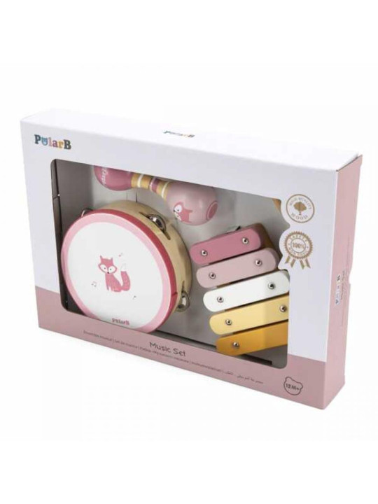 Instrumenty zostały wykonane z trwałego lakierowanego drewna, a do ich pomalowania zastosowano nietoksyczne farby, co gwarantuje pełne bezpieczeństwo użytkowania. Zestaw jest przeznaczony dla dzieci od 12 miesiąca życia i jest odpowiedni zarówno dla chłopców, jak i dziewczynek.