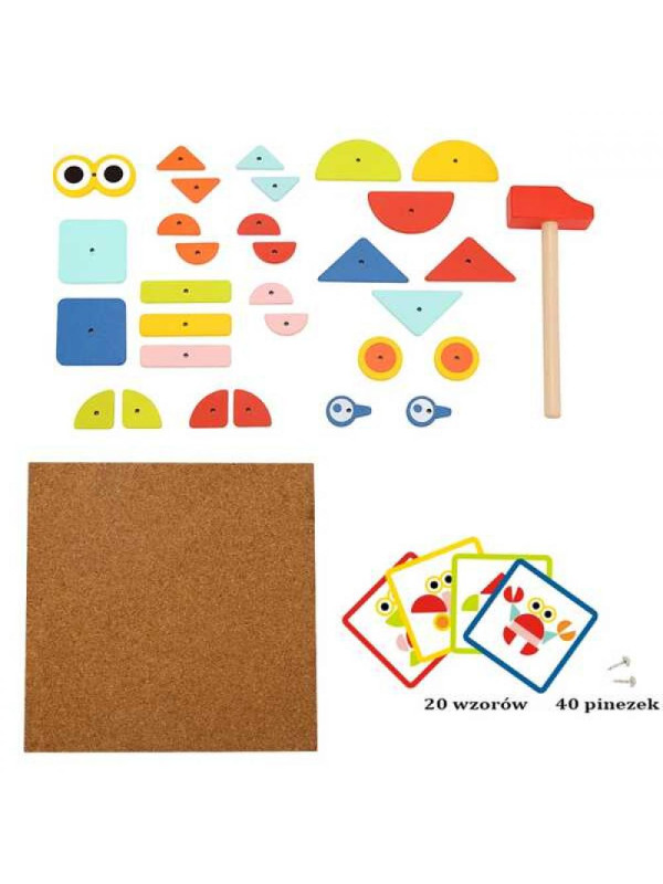 Zabawka posiada 10 dwustronnych kart z 20 wzorami o trzech poziomach trudności. Każdy z drewnianych klocków ma otwór, dzięki czemu dziecko może z łatwością przybijać je do tablicy korkowej za pomocą pinezek. Zabawę można dodatkowo urozmaicić, prosząc dziecko o zapamiętanie i odtworzenie obrazka z pamięci, co wspaniale rozwija jego koncentrację i zdolności zapamiętywania.