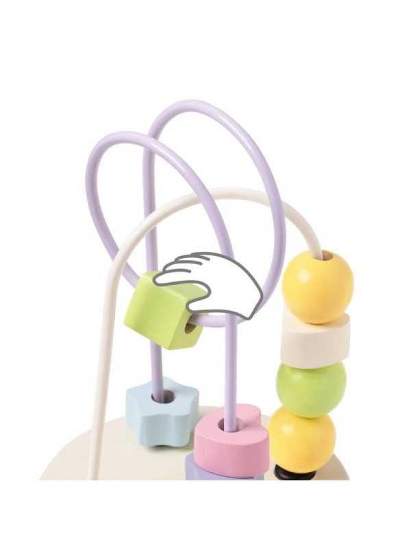• Labirynt z koralikami – element dla nieco starszych dzieci, który pozwala na ćwiczenie koncentracji i zdolności manualnych poprzez przesuwanie koralików po ścieżce.