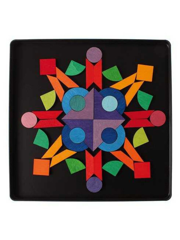 Układanka magnetyczna. Drewniane kolorowe klocki Grimm’s o geometrycznych kształtach z błyszczącymi kamieniami, w metalowym pudełku. Zestaw można łączyć z innymi magnetycznymi puzzlami Grimm’s tworząc rozbudowane kompozycje.