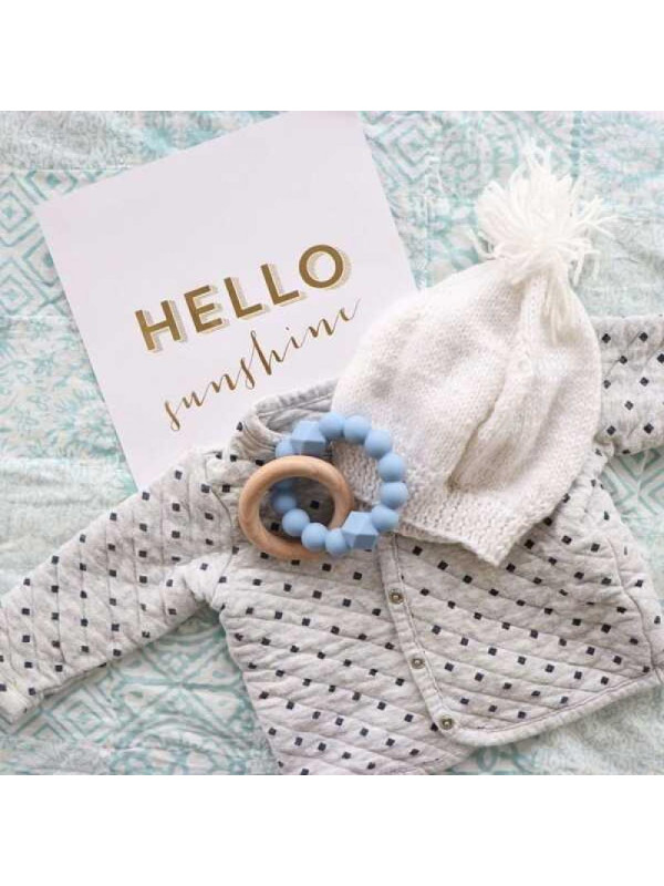 Gryzak dla dziecka wykonany z dwóch elementów. Gładkie kółko z drewna bukowego połączone z silikonowym gryzakiem sensorycznym o ciekawym kształcie.