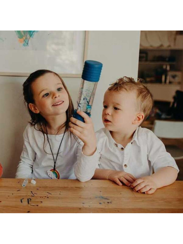 Butelka sensoryczna do samodzielnego złożenia, która pomaga dzieciom zapanować nad emocjami. Wprawianie jej w ruch i przyglądanie się temu, co dzieje się w jej wnętrzu uspokaja, wycisza i pozwala maluchom wyregulować oddech. Rodzice i terapeuci cenią sobie takie narzędzie w nauce skupienia i koncentracji. Producent przewidział możliwość zakupu wielu nietuzinkowych wzorów wypełnień.