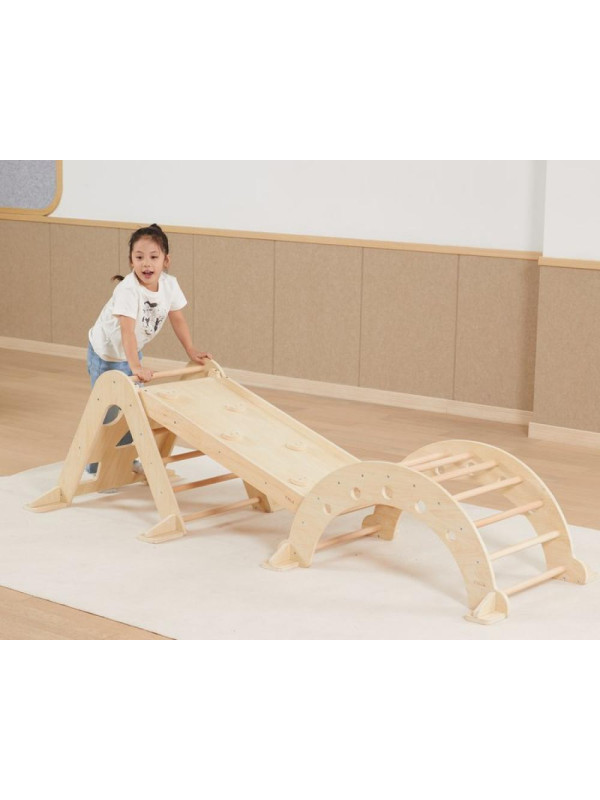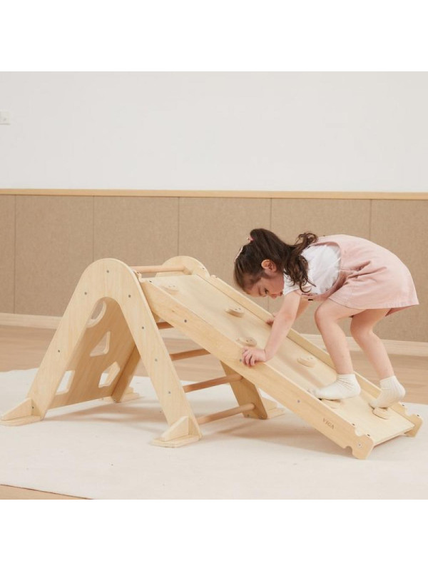 VIGA Drewniana Zjeżdżalnia oferuje dwie funkcje w jednym produkcie: po jednej stronie znajduje się płaska powierzchnia, która może być wykorzystywana jako zjeżdżalnia lub kładka, natomiast druga strona to ścianka wspinaczkowa z kilkoma elementami do wspinaczki. Takie rozwiązanie pobudza wyobraźnię i zachęca do aktywności fizycznej.