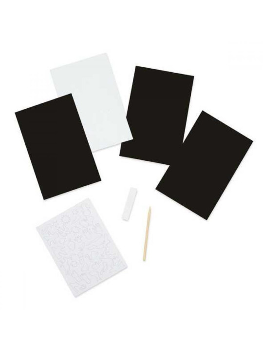 W skład zestawu wchodzi 4 różnorodne kartki do zdrapywania, wykonane z wysokiej jakości materiałów. Pod czarną lub białą wierzchnią warstwą kryje się kolorowe, tęczowe czy holograficzne tło, które nadaje każdej pracy unikalny charakter. Dzięki temu dzieci mogą wydrapywać nowe wzory i tworzyć zaskakujące obrazki, które można później oprawić w ramki i zawiesić na ścianie jako oryginalne dekoracje.