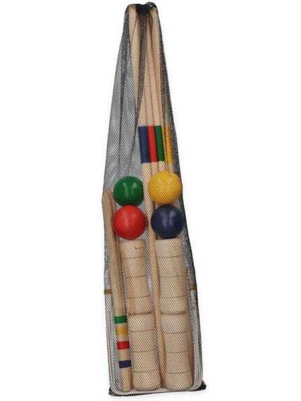 • 4 duże drewniane kije, skręcane z dwóch części i końcówki, każdy oznaczony innym kolorem, aby łatwo rozpoznać swój sprzęt.