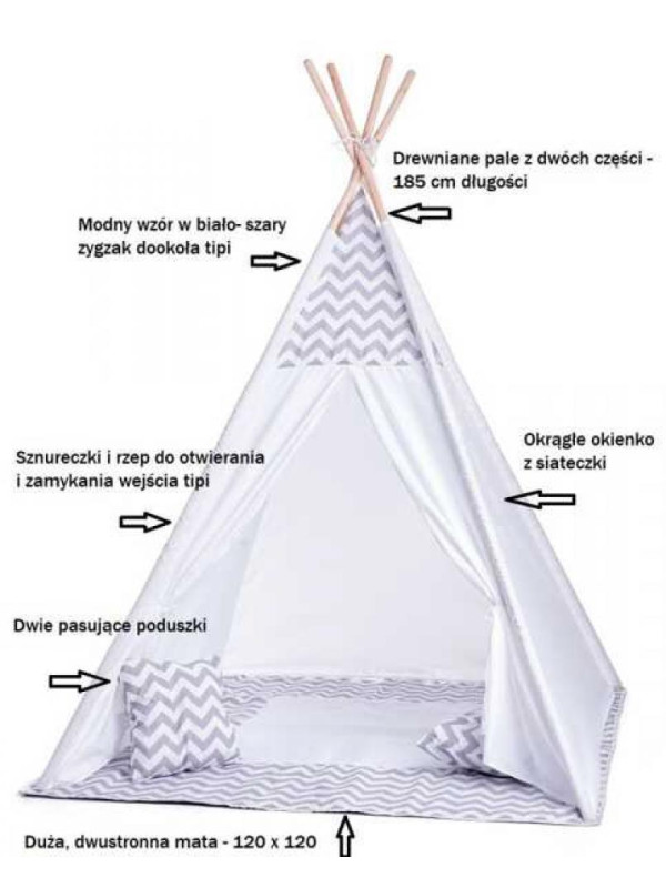 Nasz tipi, wykonany z dbałością o szczegóły, wyróżnia się biało-szarym wzorem zygzaka i neutralnymi kolorami, które doskonale wpisują się w nowoczesne wnętrza. Wysokość namiotu w najwyższym punkcie wynosi około 130 cm, co sprawia, że jest przestronny i wygodny dla dzieci.