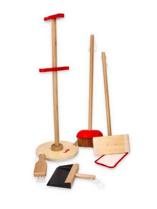 W zestawie znajdują się różnorodne narzędzia do sprzątania, które wyglądają jak prawdziwe, ale są dostosowane do małych rączek. Całość jest umieszczona na poręcznym stojaku, który pozwala na łatwe przechowywanie wszystkich elementów. Zawartość zestawu to: