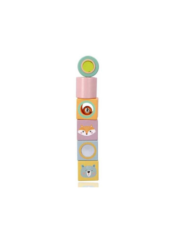 Drewniane klocki odkrywców to niezwykle atrakcyjna zabawka dla najmłodszych, która zachęca do odkrywania świata. Zestaw składa się z sześciu elementów, w tym czterech sześcianów oraz dwóch walców, z każdy z nich pełniących inne, interesujące funkcje wizualne i dźwiękowe. Te kolorowe klocki są idealne dla dzieci od 12 miesiąca życia, które zaczynają poznawać otoczenie.