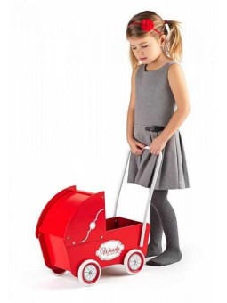 Elegancki drewniany wózek dla lalek w kolorze czerwonym to znakomita zabawka, która z pewnością przypadnie do gustu dzieciom, które uwielbiają bawić się lalkami i pluszakami. Dzięki przemyślanej konstrukcji wózek może służyć nie tylko jako pojazd dla ulubionych zabawek, ale również jako chodzik-pchacz podczas pierwszych spacerów dziecka.