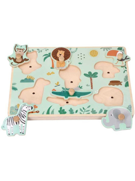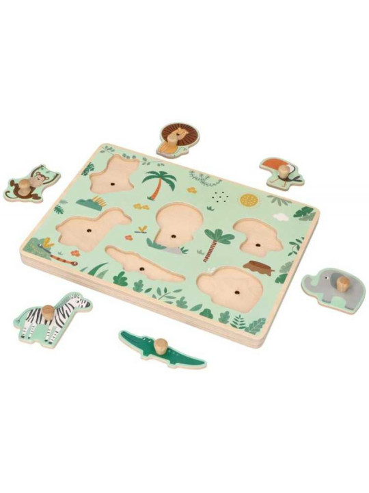 Układanka jest perfekcyjnie wyprofilowana do małych rączek dziecka, co pozwala na łatwe dopasowywanie elementów. Zabawka jest wykonana z naturalnego drewna, co gwarantuje jej trwałość i bezpieczeństwo podczas użytkowania. W skład układanki wchodzi 6 zwierzątek z safari, takich jak: lew, tukan, zebra, krokodyl, słonik oraz małpka. Każde z tych zwierząt uruchamia realistyczny dźwięk, co dodatkowo zachęca do zabawy.