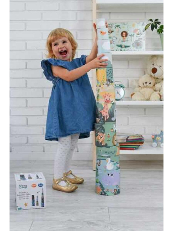 Piramida z kubeczków Safari to wspaniały zestaw dla dzieci powyżej 18 miesiąca życia. Zabawka składa się z 10 różnych kubeczków, które można układać jeden na drugim, tworząc wieżę o wysokości 96 cm. Wykonane z twardej tektury kubeczki są nie tylko kolorowe, ale również pełne sympatycznych ilustracji przedstawiających zwierzęta z safari.