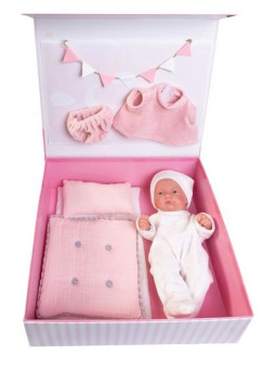 Lalka posiada duże niebieskie oczy oraz delikatne włoski na główce, które imitują włosy, co zwiększa realistyczność wyglądu. Bobas ubrany jest w białe śpioszki w różowe gwiazdki oraz czapkę. W zestawie znajduje się także dodatkowy strój w paski - jednolita sukienka na krótki rękaw oraz bufiaste spodenki. Do lalki dołączona jest poduszeczka z kołderką, co pozwala na kreatywną zabawę i przebieranie malucha.