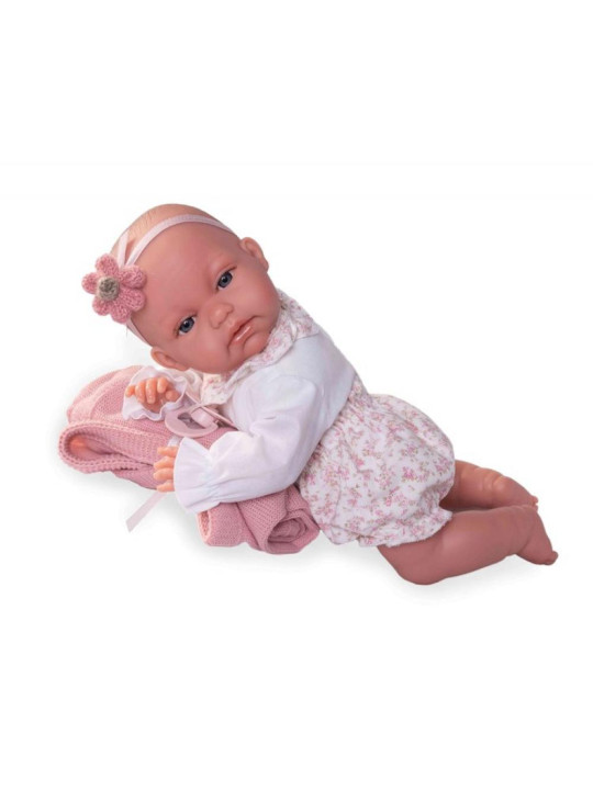 Toneta ubrana jest w elegancką białą koszulę z okrągłym kołnierzykiem oraz bufiaste spodenki z motywem w kwiaty, co nadaje jej uroczy wygląd. Stylizację dopełnia wiązana opaska z wełnianym kwiatkiem oraz różowy dziany kocyk, idealny do przytulania. Lalka posiada również smoczek na tasiemce, co dodaje realizmu.