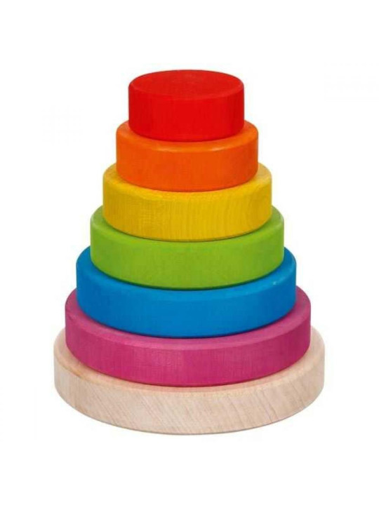 W skład zestawu wchodzi sześć kolorowych krążków o różnych rozmiarach oraz podstawa w naturalnym kolorze drewna. Podczas zabawy dziecko może nauczyć się układać krążki od największego do najmniejszego, co wspiera rozwój umiejętności logistycznych i poznawczych. Zabawka świetnie rozwija koordynację ręka-oko oraz poprawia motorykę małych rączek dziecka. Wartości edukacyjne tej zabawki są nieocenione, umożliwiając naukę kolorów, rozmiarów oraz porządku.