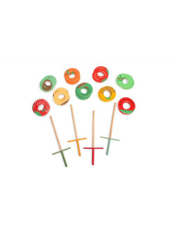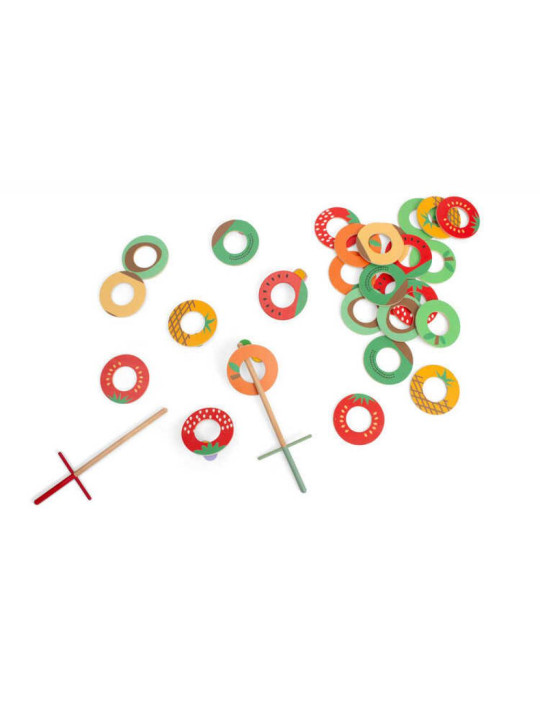 Wszystkie elementy gry wykonane są z wysokiej jakości drewna, co gwarantuje trwałość i bezpieczeństwo. Drewniane dyski przedstawiają różnorodne owoce, takie jak truskawki, pomarańcze, arbuzy i ananasy, co dodaje zabawie kolorów i uczy dzieci rozpoznawania różnych owoców.