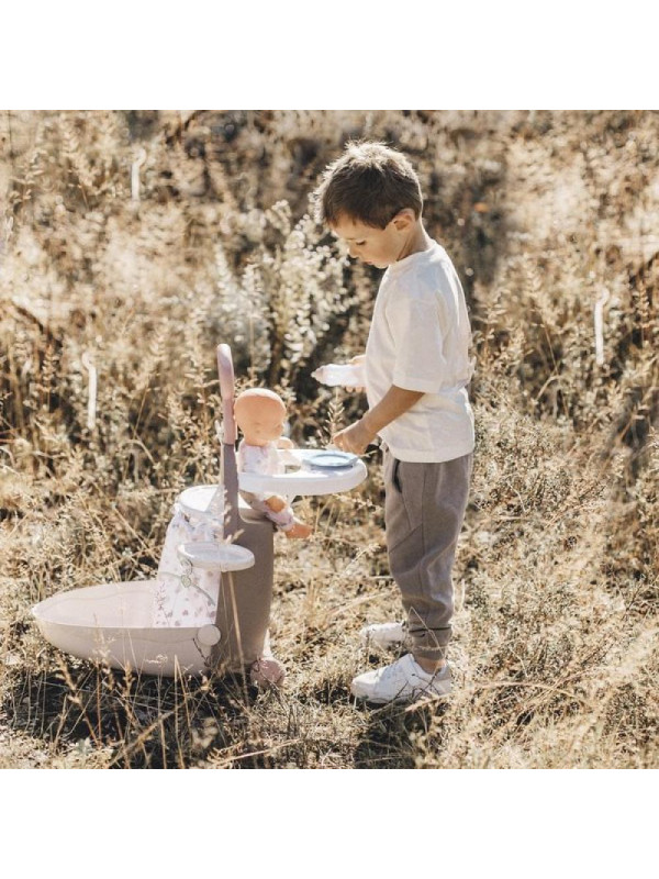Wielofunkcyjna walizka to centrum opieki 3w1, które po rozłożeniu zamienia się w wysokie krzesełko do karmienia, miejsce zabaw z stolikiem i akcesoriami, oraz łóżeczko dla lalki z baldachimem i kołderką. Na bokach walizki znajdują się praktyczne półeczki, na których można ustawić drobiazgi lub powiesić wieszaczki z garderobą. Zestaw zawiera 6 akcesoriów, takich jak: talerzyk, łyżeczka, butelka do karmienia, kołderka oraz 2 wieszaczki.