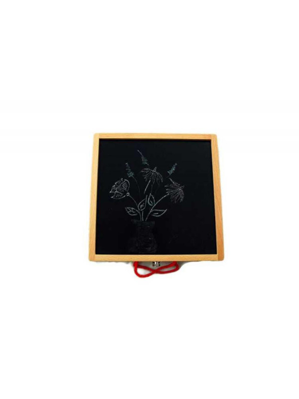 Tablica jest zaprojektowana jako zamykana walizka z wygodnymi uchwytami wykonanymi z czerwonego sznurka. Z zewnątrz powierzchnia jest pokryta czarną powłoką, idealną do rysowania kredą. Wewnątrz znajduje się magnetyczna część, która pozwala na przyczepianie magnesów. Dzięki temu, zarówno rysowanie kredą, jak i tworzenie obrazków z magnesów jest możliwe na jednej zabawce.