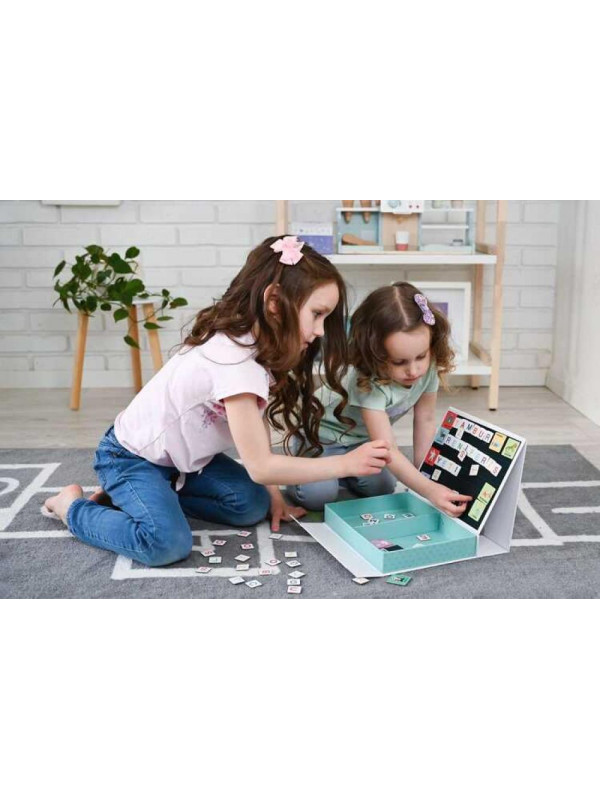 Po otwarciu opakowania naszym oczom ukazują się dwie przegródki wypełnione sporą ilością magnetycznych liter oraz obrazków. Co ciekawe, opakowanie pełni funkcję magnetycznej tablicy, co sprawia, że wszystkie elementy można wygodnie przechowywać i transportować. Dzięki linijkom na tablicy, dziecko może układać słowa w jednej linii, co w przyszłości pomoże w estetycznym pisaniu w zeszycie.