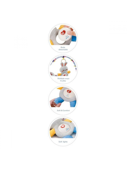 Interaktywny króliczek wyposażony jest w trzy różne kołysanki oraz dźwięki śmiechu dziecka, które pomagają maluchowi zasnąć i zapewniają mu rozrywkę. Miękki w dotyku materiał oraz delikatne wypełnienie sprawiają, że zabawka jest idealna do przytulania i gryzienia. Króliczek posiada też możliwość zaczepienia na pałąku, co czyni go doskonałym dodatkiem do wózka czy kołyski.