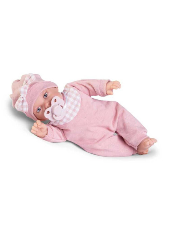 Lalka jest ubrana w miękką, zapinaną na rzep piżamkę w kolorze pudrowego różu oraz słodką czapeczkę z kokardką w kratkę. Całość dopełnia smoczek zawieszony na satynowej tasiemce. Wszystkie części garderoby są łatwe do zdjęcia, co umożliwia przebieranie bobasa.