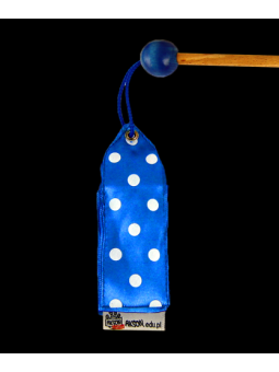 Część materiałowa wykonana jest z błyszczącej, barwnej taśmy w białe groszki o długości 1,5 m.
