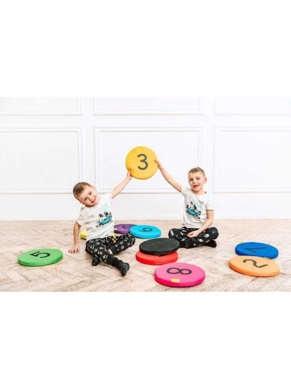 Poduszki EKOSKÓRA o wysokości  6 cm zestaw Liczby 1-10MINI PUFKI    Poduszki  zestaw liczby 10 szt. to ważny element wyposażenia każdego animatora, przedszkola i szkoły.  Poduszki mają szerokie zastosowanie w pracy z grupą. Idealnie sprawdzą się we wszelkiego rodzaju  zajęciach edukacyjnych i integracyjnych. To doskonałe narzędzie do gier zespołowych w pomieszczeniach jak i w plenerze, umożliwia czerpanie radości płynącej z ruchu i przebywania w grupie. Poduszki wypełnione są wkładem z gąbki, co sprawia że są wygodne a zarazem lekkie i bezpieczne, dzięki czemu mogą nawet spełnić rolę dysku do rzucania!  Materiał: barwny, wytrzymały. Produkt, dzięki swojej strukturze jest bardzo łatwy do dezynfekcji!    Kolory pokrowców: czarny, fioletowy, różowy, granatowy, błękitny, ciemny zielony, jasny zielony, żółty, pomarańczowy, czerwony.  Średnica: 30 cm Wysokość: 6 cm   Zestaw zawiera: 10 sztuk poduszek ze zdejmowanymi pokrowcami z nadrukiem  Produkt zalecany dla dzieci powyżej 3 miesiąca życia Produkt polski.    Centrum Akson jest producentem chust animacyjnych akson, a także woreczków i szarf gimnastycznych, tuneli animacyjnych, kolorowych piłeczek do suchych basenów i zabaw z chustą i wielu innych akcesoriów edukacyjnych i animacyjnych. Od lat jest też propagatorem Pedagogiki Zabawy i Pedagogiki Cyrku w Polsce i poza granicami kraju. Kupuj najlepsze! Kupuj u źródła!     Cena za komplet