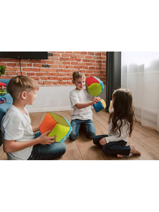 Niezwykle barwna kostka sensoryczna daje nowe możliwości zabaw. Każda ścianka to inny materiał o innej fakturze, każda dostarcza innych wrażeń dotykowych, rozbudza wiele różnych emocji. Kostka rozwija zmysł dotyku, ćwiczy wrażliwość sensoryczną. Ponadto znakomicie wspomaga rozwój koordynacji wzrokowo - ruchowej, ćwiczy refleks i spostrzegawczość, równocześnie umożliwia czerpanie radości płynącej z ruchu i przebywania w grupie. Kostka wykonana jest z kilku rodzajów tkanin, każda o innej strukturze i w innym kolorze, wypełniona miękką kulka silikonową, dzieki czemu jest bezpieczna i przyjemna w dotyku.