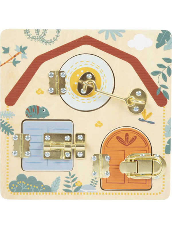 Tablica zawiera różne mechanizmy zamków: hak do drzwi, zasuwę oraz zatrzask, które dzieci mogą otwierać i zamykać, rozwijając swoje zdolności motoryczne i ucząc się przydatnych umiejętności. Dzięki tej zabawce dzieci doskonalą precyzyjny chwyt, poprawiają koordynację ręka-oko, a także ćwiczą koncentrację i cierpliwość.