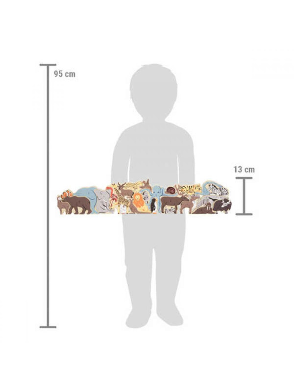 Układanka wykonana jest z trwałego drewna, a poszczególne elementy są wystarczająco duże i grube, aby dzieci mogły je łatwo chwytać i manipulować nimi. Poszczególne figurki zwierząt mogą być również używane oddzielnie, umożliwiając fantazyjne zabawy. Każdy element jest starannie zaprojektowany, aby wspierać rozwój dzieci na różnych płaszczyznach: