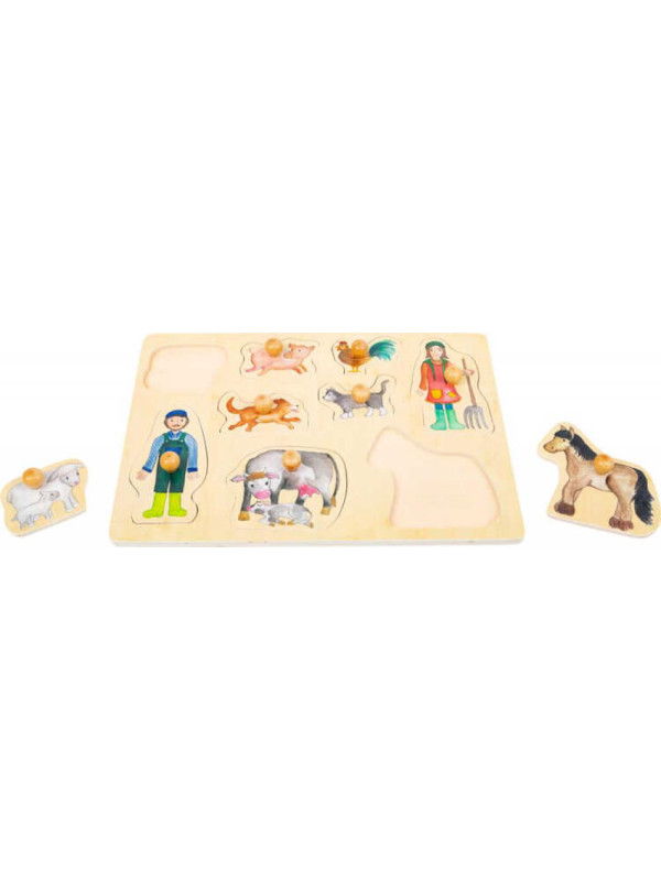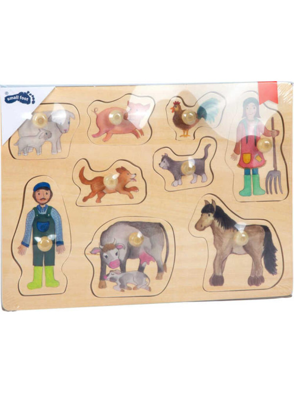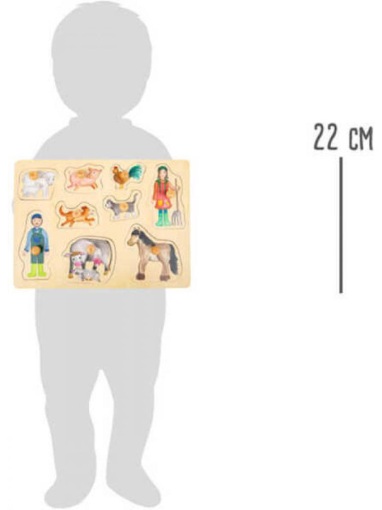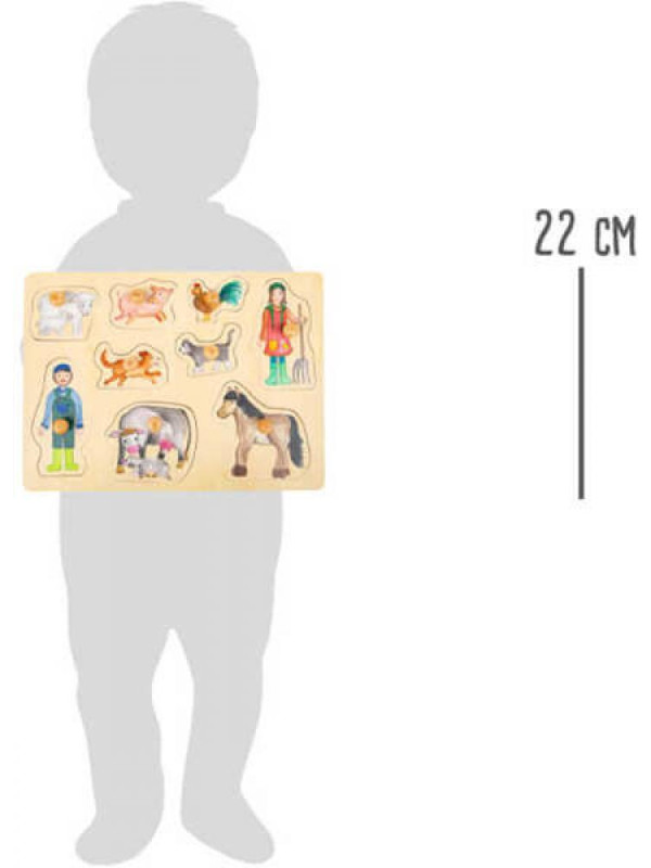 Każdy z elementów jest wyposażony w drewniany uchwyt, który ułatwia maluchom podnoszenie i dopasowywanie elementów do wyciętych miejsc na drewnianej podstawce. Kolorowe i ręcznie rysowane ilustracje zachęcają dzieci do nauki rozpoznawania zwierząt i postaci związanych z życiem na farmie.