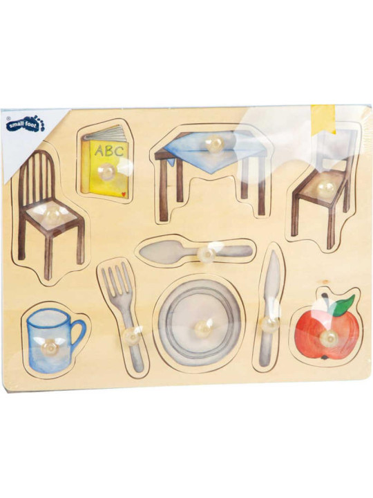 Ta drewniana układanka z uchwytami to doskonały sposób na naukę i zabawę dla najmłodszych. Składa się z deski z wyciętymi kształtami oraz 9 kolorowymi elementami, które przedstawiają codzienne przedmioty. Każdy element posiada wygodny drewniany uchwyt, ułatwiający jego dopasowanie do odpowiedniego miejsca.