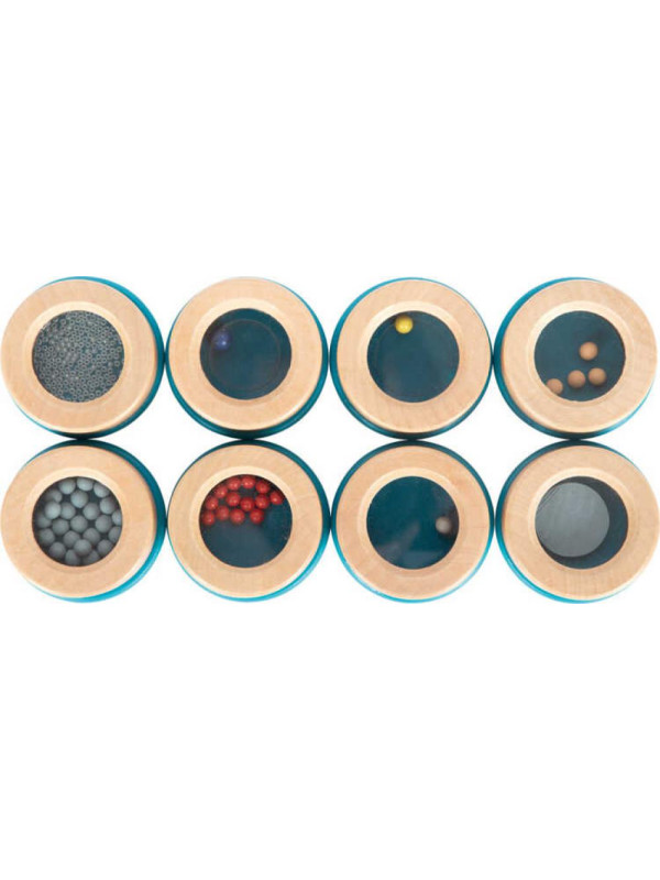 Zestaw jest idealny dla dzieci oraz osób z zaburzeniami wzroku. Dzięki różnym rozmiarom pojemników oraz wypukłemu wieczku, elementy gry są łatwe do chwycenia. Każdy pojemnik zawiera różne materiały, takie jak drewniane kulki, metalowe kuleczki, plastikowe koraliki czy drewniane monety, co zapewnia różnorodne doświadczenia słuchowe.