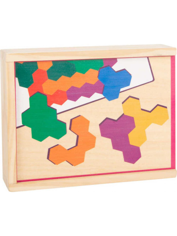 • Kolorowe drewniane puzzle: Elementy w żywych kolorach (fioletowym, czerwonym, żółtym, zielonym, pomarańczowym i niebieskim), które tworzą różnorodne wzory sześciokątne.