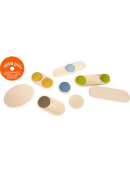 • Kilka mniejszych, różnokształtnych drewnianych płyt z gumowymi kółkami w różnych kolorach: brązowym, zielonym, żółtym i niebieskim.
