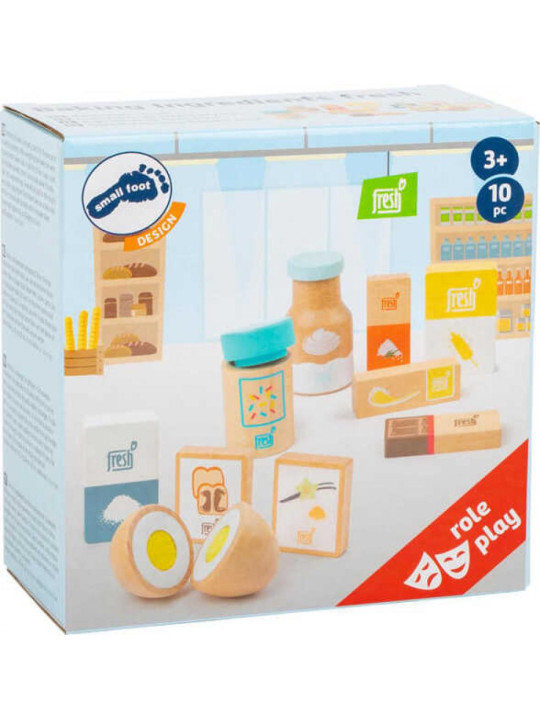 Ten zestaw drewnianych składników jest doskonałym dodatkiem do każdej dziecięcej kuchni lub sklepu. Dzięki łatwo rozpoznawalnym ilustracjom, dzieci, które jeszcze nie umieją czytać, mogą łatwo zidentyfikować poszczególne składniki.