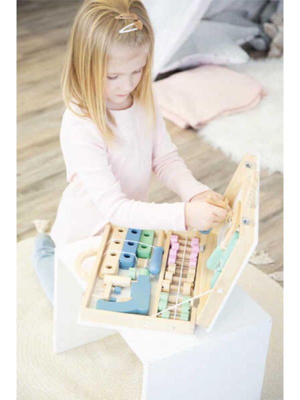 Prezentujemy skrzynkę narzędziową "Nordic", idealne rozwiązanie dla młodych entuzjastów majsterkowania. To praktyczne pudełko z solidnymi zapięciami i drewnianą rączką doskonale nadaje się do przenoszenia i zabawy w dowolnym miejscu. Unikalny, skandynawski design z widocznymi drewnianymi elementami i pastelowymi kolorami z pewnością przyciągnie uwagę każdego dziecka.