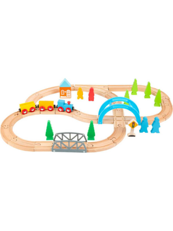 Elementy zestawu wykonane są z wytrzymałych materiałów, takich jak drewno, metal i tworzywo sztuczne, co gwarantuje trwałość i bezpieczeństwo. Wymiary złożonej trasy to około 45 x 60 x 9,5 cm, a lokomotywy z wagonami to 21 x 3,5 x 4 cm.