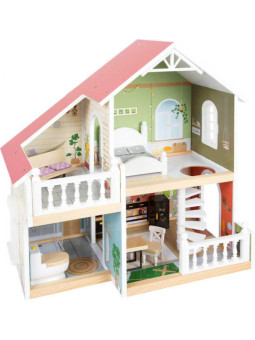 Drewniany domek składa się z 3 pokoi, tarasu na dachu oraz ogrodu. Dwa piętra połączone są kręconymi schodami, które dodają uroku i realizmu. Elegancka, jasna fasada oraz modne, nowoczesne wnętrze sprawiają, że domek doskonale wpisuje się w estetykę współczesnych zabawek. Na uwagę zasługują również otwierane okna oraz prysznic z plexiglasu, co dodaje autentyczności.
