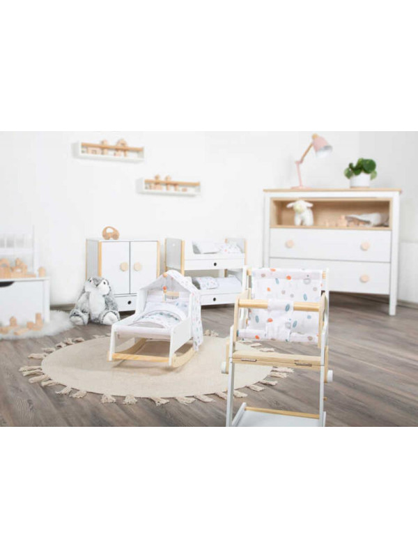 Każda lalka potrzebuje swojego miejsca do snu, a kołyska dla lalek "Little Button" jest idealnym wyborem. Cechuje się nowoczesnym, skandynawskim designem oraz subtelną formą, ta kołyska nie tylko wygląda elegancko, ale jest również funkcjonalna. Dzięki uniwersalnym, odwracalnym pościelom i dużemu kocykowi, lalki i pluszowe zwierzątka do 46 cm wielkości mogą spać spokojnie pod baldachimem. Sznurki i baldachim są zdejmowane, co pozwala na przekształcenie kołyski w stylowy leżak.
