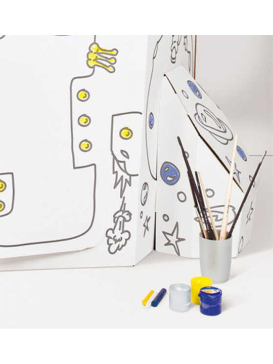 Przygotuj się na niezapomnianą podróż kosmiczną z rakietowym domkiem kartonowym do kolorowania. Idealny do zabawy w domu, ten kartonowy domek w kształcie rakiety zabierze dzieci na niezapomnianą wyprawę na księżyc lub przez pokój dziecięcy.