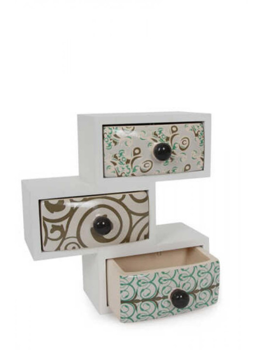 Dekoracja - Szafka Apteczna Evi to wyjątkowy element wyposażenia dziecięcego pokoju, idealny do przechowywania drobnych skarbów i cennych drobiazgów. Zaprojektowana z myślą o funkcjonalności i estetyce, ta biała drewniana szafka składa się z trzech szuflad ułożonych schodkowo. Każda szuflada ozdobiona jest pięknymi zielonymi i brązowymi ornamentami, co nadaje jej unikalny i atrakcyjny wygląd.