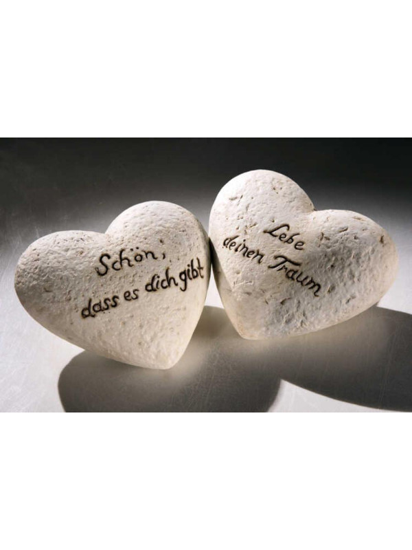 Zestaw zawiera 2 serca o wyglądzie naturalnego kamienia, z wyjątkowymi napisami w języku niemieckim. Jeden z napisów to: "Schön, dass es dich gibt", co znaczy "Dobrze, że jesteś", oraz "Lebe deinen Traum", co tłumaczy się jako "Żyj swoim marzeniem".