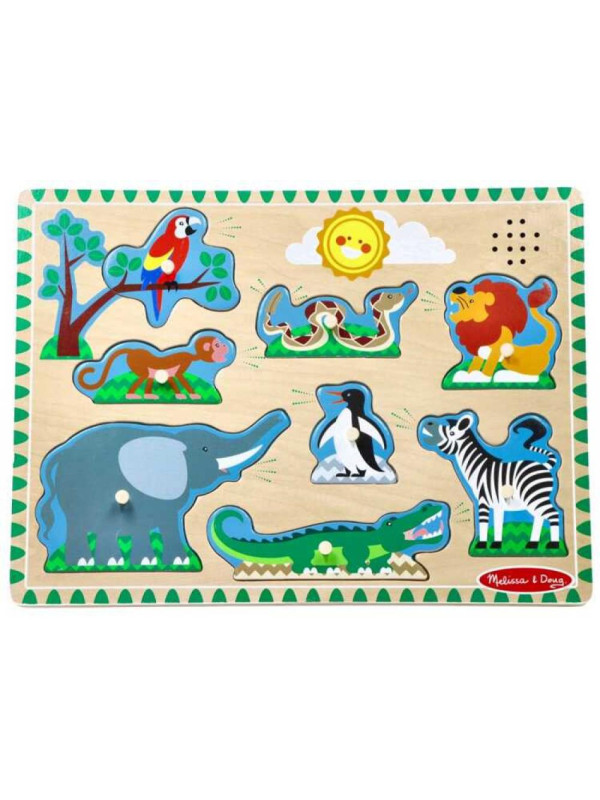 Te drewniane puzzle to nie tylko kolorowa układanka, ale również interaktywna zabawka. Każde ze zwierzątek, po włożeniu na swoje miejsce, wydaje dźwięk odpowiadający swoim naturalnym odgłosom. Lew ryczy, słoń trąbi, a wąż syczy, co dodatkowo zachęca dziecko do zabawy oraz poznawania świata zwierząt.