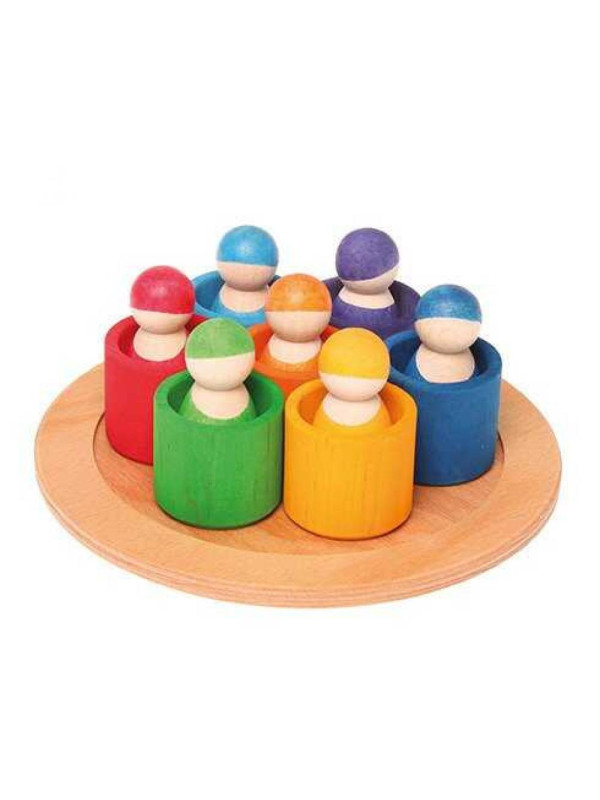 Zestaw 7 drewnianych figurek w nasyconych kolorach, z których każda ma własne gniazdko/kubeczek tej samej barwy.