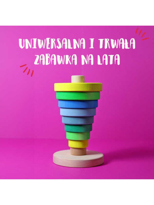 Stożkowa wieża to klasyka wśród zabawek dla najmłodszych. Jej unikalność tkwi w prostocie i doskonałym wykonaniu. Drewniane krążki zostały tak wyszlifowane i wykończone, by ich dotykanie było prawdziwą przyjemnością. Są aksamitnie gładkie, ciepłe i miękkie. Wieża to oczywiście nie tylko walory estetyczne. To przede wszystkim świetna zabawka. Dziecko może układać ją na różne sposoby np. zrezygnować z podstawki i bawić się krążkami oddzielnie, ale też łączyć je z innymi klockami i zabawkami Grimm's. Podczas wszystkich tych aktywności maluch trenuje swoje zdolności manualne, uczy się precyzji ruchów i rozwija wyobraźnię.